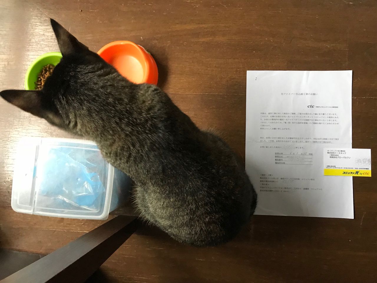 工事内容は私の家の敷地内に電柱があります。光通信工事を近隣の家対象に行いたいとの事。社印も無い紙切れ一枚がポストに投函されていました。何かある様だったら電話をよこしてだってさ。工事を止めたから事後名刺を持って来ましたよ、下請けがさ。だから工事はダメと言ってあげたよ。