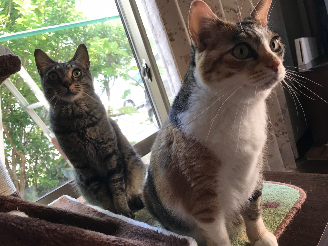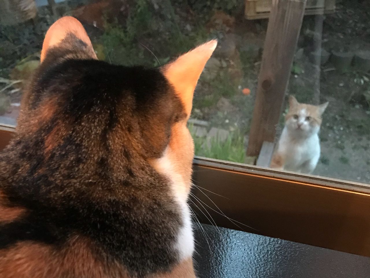 台の上に伏せて窓からジッとお外を見ています。地域猫ちゃんの動きに応じて右見たり左見たりしています。地域猫ちゃんが離れて行くと窓から窓へ移って追いかけて、見えなくなると、あっ行っちゃった、あーあって感じ。